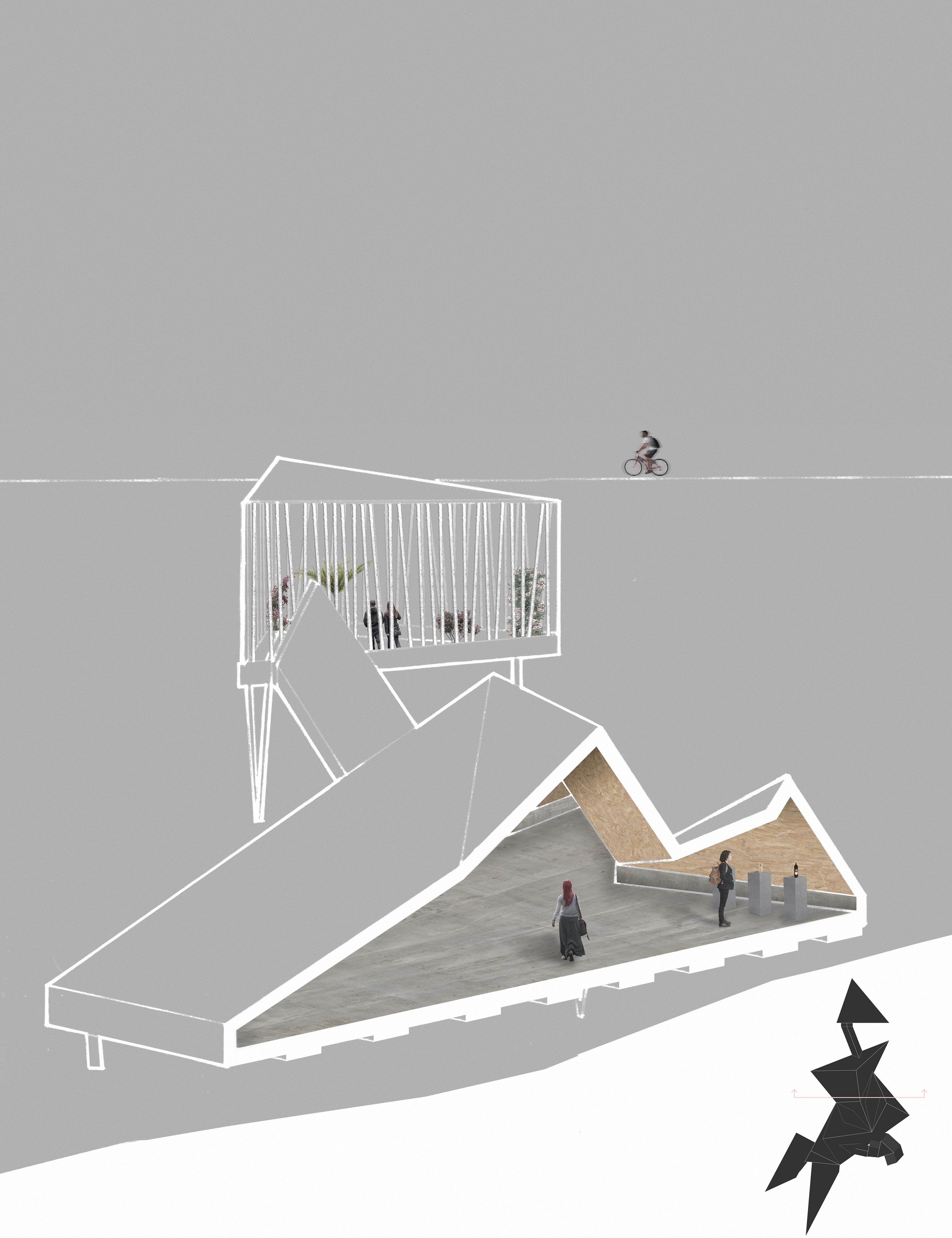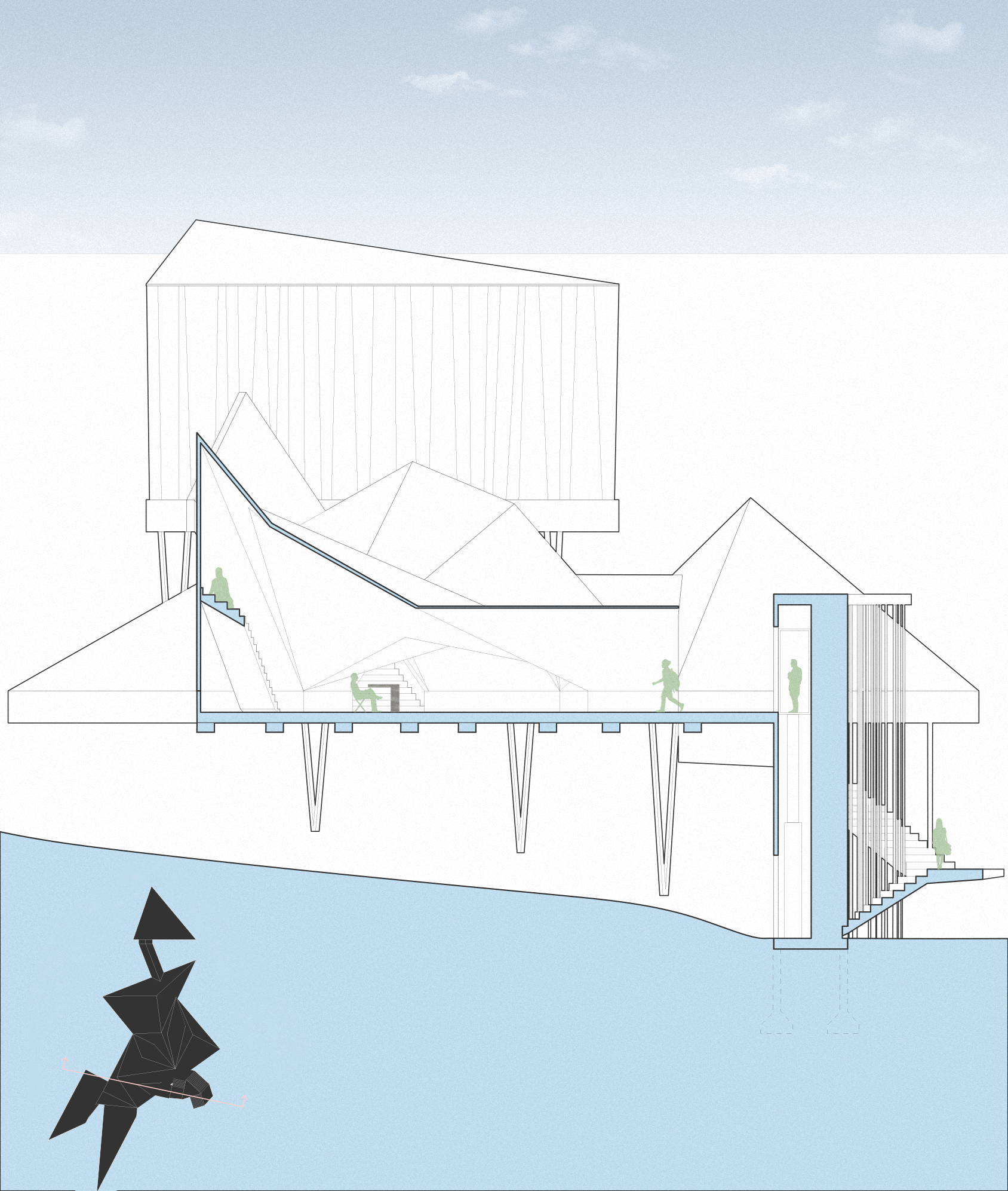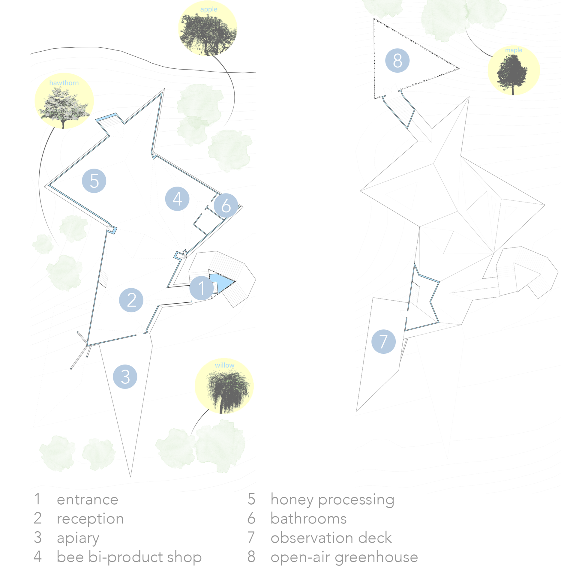 Vignette showing the approach one would take to get to the entrance. There is a hierarchy with the bees on top and the occupants arriving under the apiary.