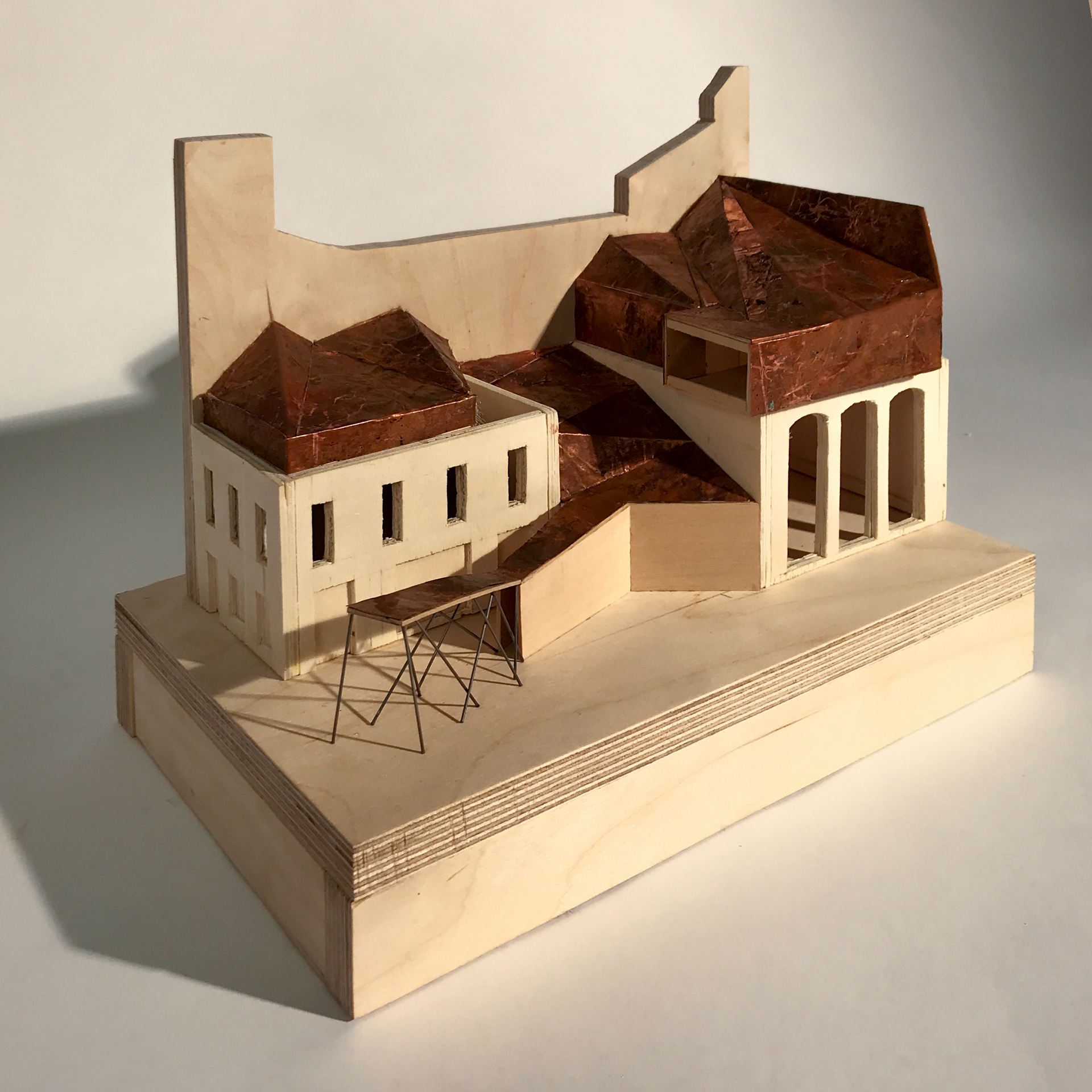 Using zinc flashing on tin panels, the facade takes advantage of galvanic corrosion to create rich patinas where water runs on the building.