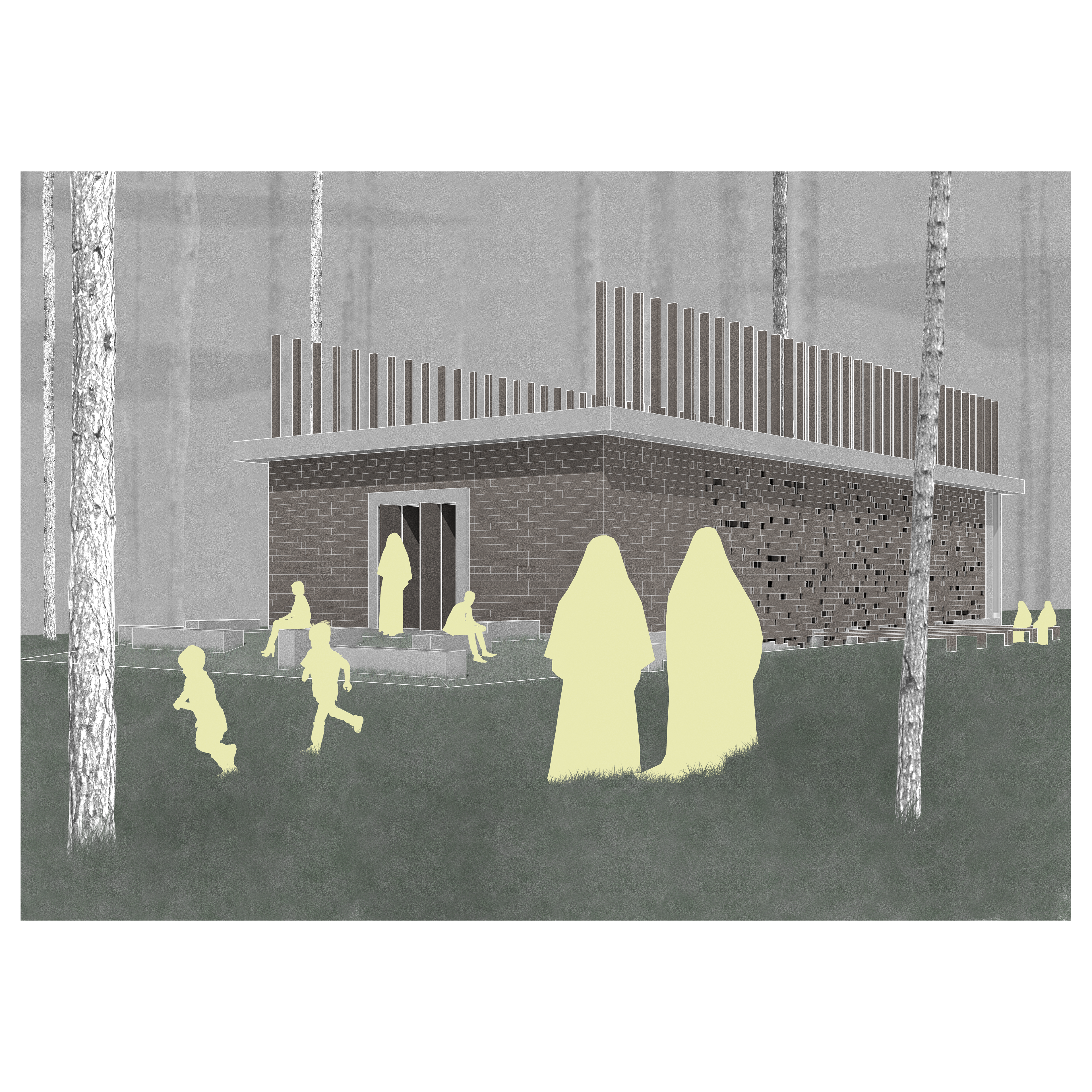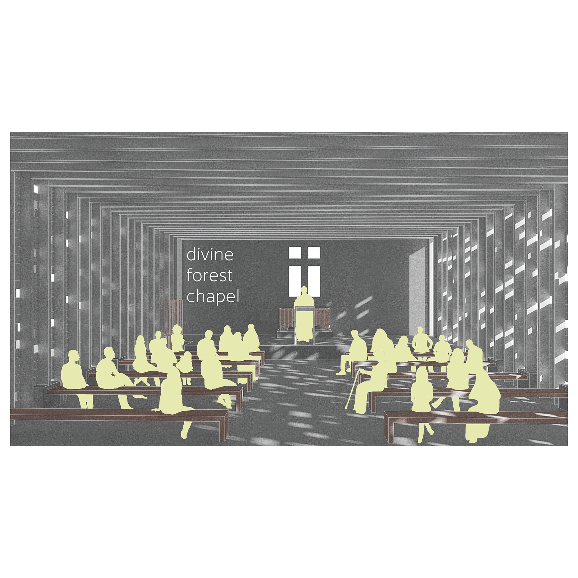 The Divine Forest Chapel is a canvas for the Rwandan Clarisses and surrounding community to create a masterpiece. The forest that encircles the chapel serves as the inspiration for the architecture. Columns continue past the concrete roof to salute the adjacent trees. The facade composes of a mosaic of spaced acacia wood planks as a tribute to classical religious stained glass mosaics simultaneously casting light and shadow in the interior to mimic a forest floor. The pews, affixed to a gear system become move-able about their axis to create interactive, adjustable space inside, or outside the chapel. The space is then no longer restricted to religious service. The Divine Forest Chapel fosters gathering, congregating, prayer, mourning, charity, and most anything in between.
